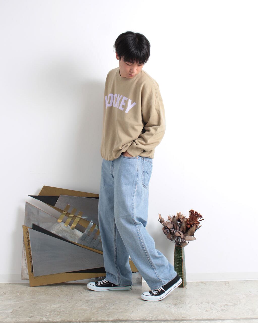 ビッグシルエットのスウェットに、存在感のある